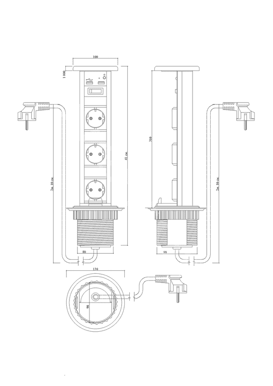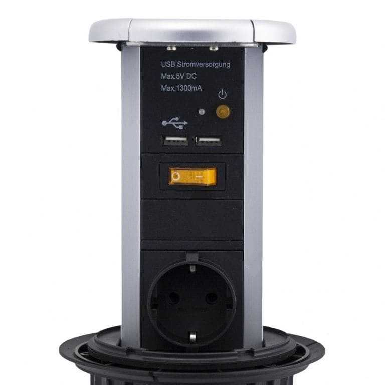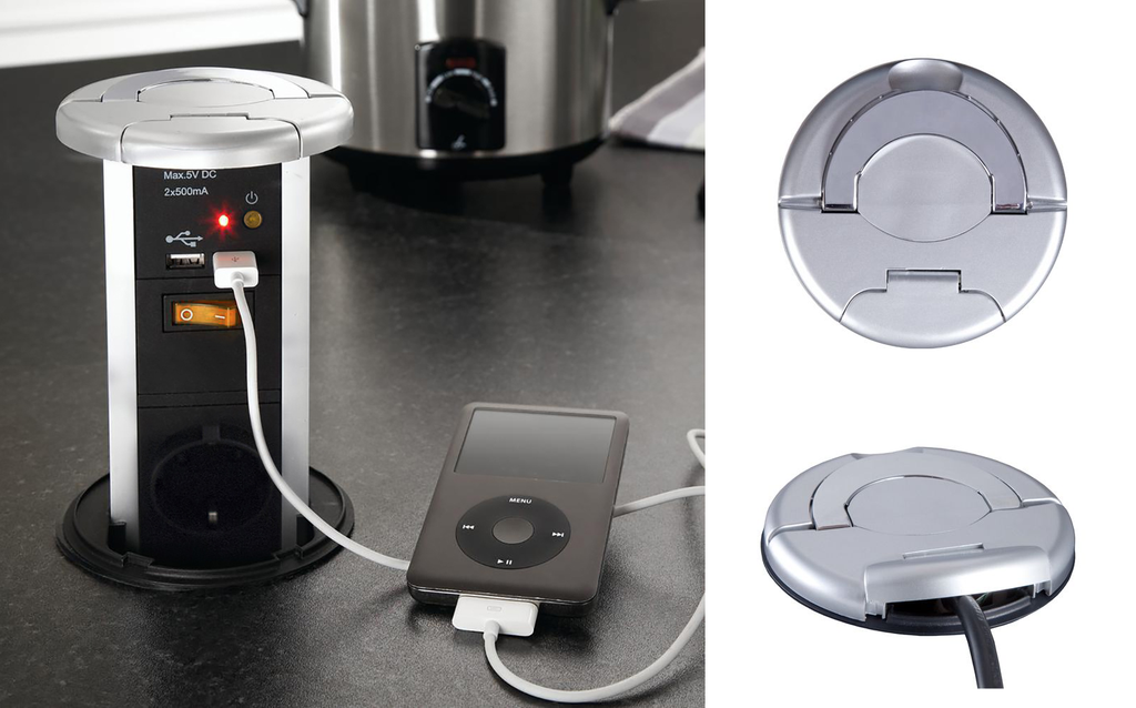 Спецификация Наименование MARK Количество розеток 3 EURO + 2 USB Напряжение 200-250 В Максимальный ток 16 А Максимальная мощность 3600 Вт Материал Боковины из алюминия, все остальное из твердого пластика Цвет корпуса Серебристый Врезное отверстие Диаметр — 90 мм USB 5V, 2.1A Выдвижная розетка сертифицирована в РФ. Гарантия 2 года. Выдвижная розетка с выключателем MARK (на 3 EURO розетки, 2 USB) Выдвижной удлинитель с выключателем на 3 EURO розетки + 2 USB разъема (Серебристый). Отличительной особенностью данного выдвижного блока является: степень защиты IP 54 (влагостойкий), наличие выключателя, а также за счет особенности конструкции вы можете «утопить» розетку в столешницу с подключенными электроприборами. Данная модель готова к эксплуатации вся внутренняя разводка уже сделана на заводе, в комплекте с сетевым шнуром длиной 2 м, необходимо только подключить изделие к розетки. Комплект поставки так же входит инструкция по установке изделия в столешницу, с подробной схемой и указанием всех размеров. Сфера применения: Выдвижные розетки отлично подходят для установки в столешницу на кухне, что помогает экономить рабочее пространство.