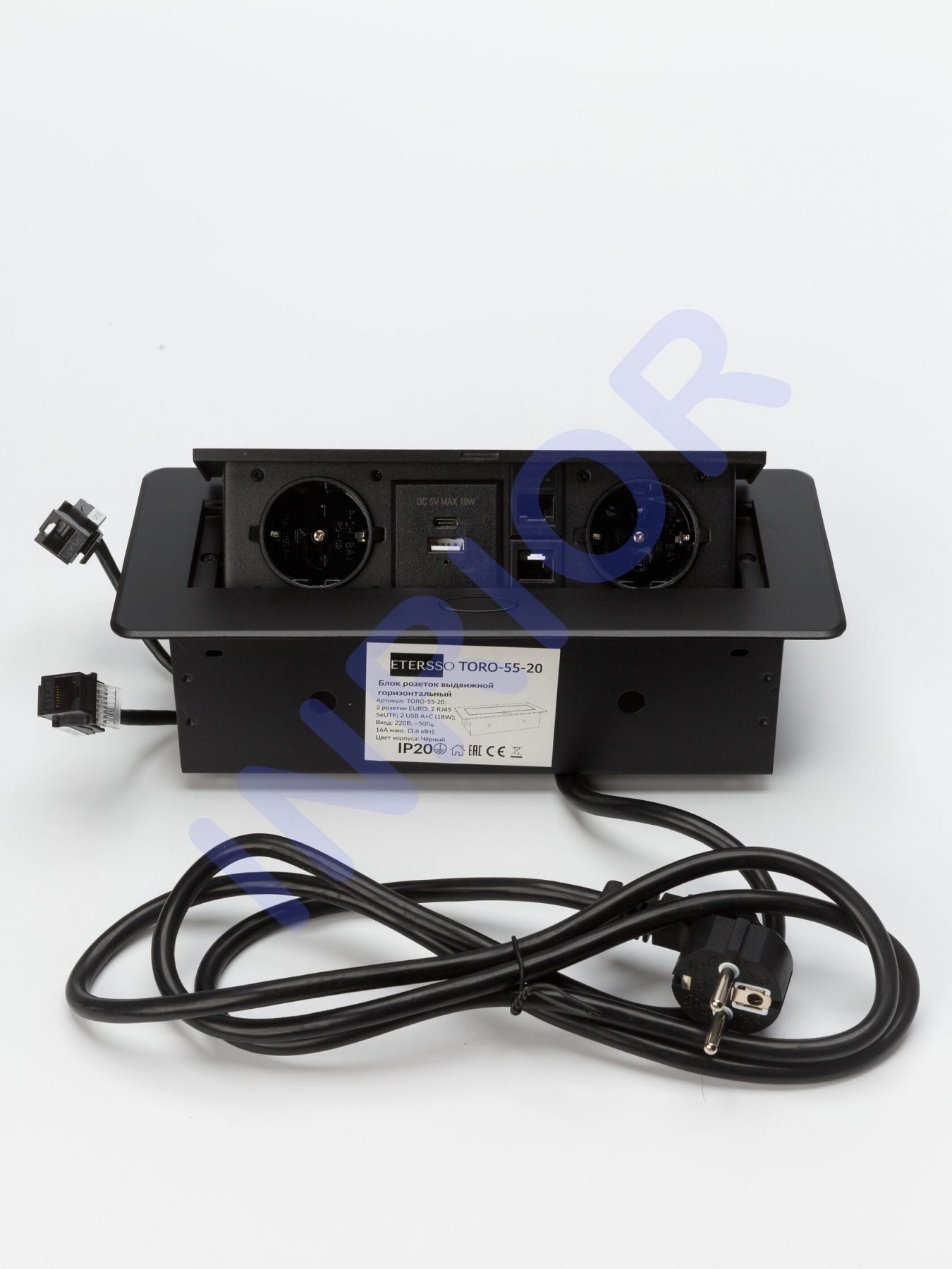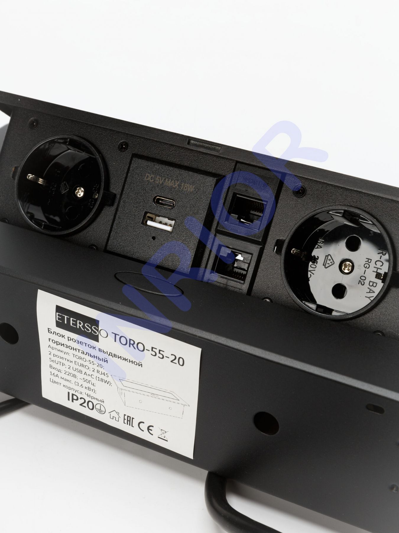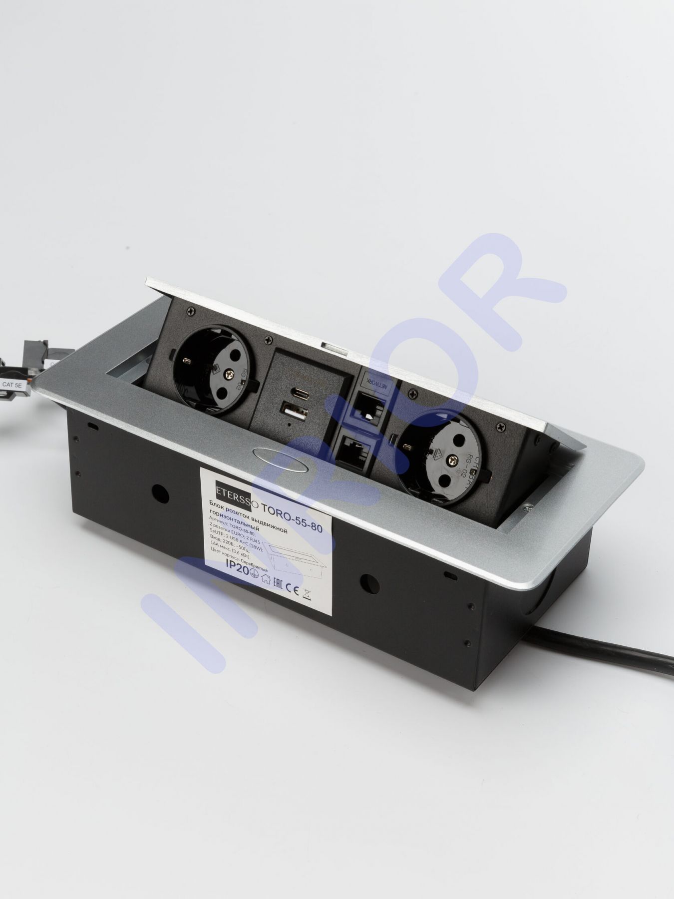 Выдвижная розетка, выдвижной блок розеток для офиса информационный TORO-55 (2 EURO розетки, 2 RJ45, 2 USB C + А (18W))