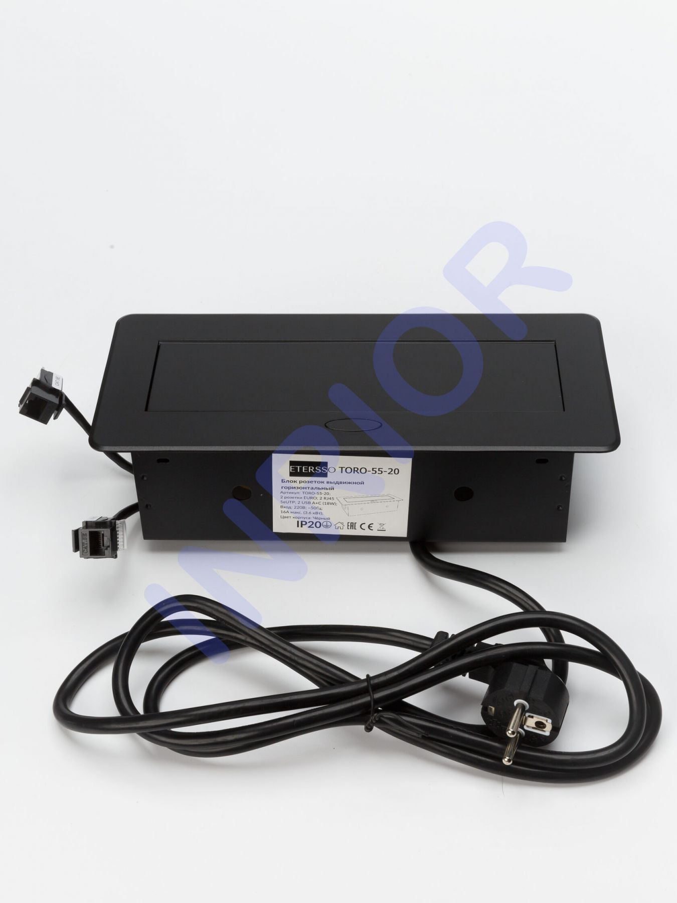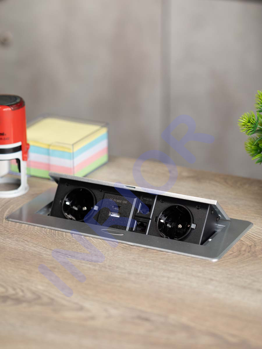 Спецификация Выдвижная розетка сертифицирована в РФ. Гарантия 2 года. Комплектация: Полностью в сборе с внутренней проводкой, монтажной коробкой, проводом 1.8 м с вилкой, RJ45 порты выполнены как удлинители, USB зарядные Наименование INRIOR TORO-55-80 Количество розеток 2 RJ45, 2 USB С + А (18W), 2 EURO Напряжение 220-250 В Максимальный ток 16 А Максимальная мощность 3600 Вт Цвет корпуса Серебристый Габаритные размеры 265х118х65 мм Врезное отверстие 225х108 мм Материал: Корпус, верхняя рамка, установочная коробка из металла Метки товара: Выдвижной розетка, удлинитель для офиса Аналог: Etersso 267J+ Гарантия на всю нашу продукцию 2 года. Полностью в сборе: с внутренней проводкой, с металлической монтажной коробкой, проводом 1.8 м с вилкой. Материал: Корпус, верхняя рамка, установочная коробка из металла Габаритный размер - 265?118?65 мм Врезное отверстие - 225х108 мм Напряжение - 220-250 В Выдвижная встраиваемая розетка, горизонтальная, INRIOR TORO-55-80 на 2 розетки, 2 USB, 2 RJ45, 2 USB C + A (18W) с кабелем 1.8 м с вилкой, розеточный блок для столов и столешниц, навесных шкафов, мебели, серебристый, удлинитель. Выдвижная горизонтальная розетка, представляет собой металлический прямоугольный розеточный блок на 2 EURO, 2 USB C + A (18W), 2 RJ45 розетки. При нажатии на кнопку на лицевой части розетки, происходит плавное открытие. Качественная порошковая окраска корпуса позволяет долгое время сохранить внешний вид нового изделия, розетка не царапается. Данная модель готова к эксплуатации вся внутренняя разводка уже сделана на заводе, в комплекте с сетевым шнуром длиной 1.8 м, необходимо только подключить изделие к розетки. Комплект поставки так же входит инструкция по установке изделия в столешницу, с подробной схемой и указанием всех размеров. Сфера применения: Выдвижные розетки отлично подходят для установки в столешницу на кухне, что помогает экономить рабочее пространство. В закрытом положении встраиваемая розетка образует со столешницей практически ровную поверхность. Также выдвижные розетки нашли распространение в офисах, переговорный залах, стойках обслуживания клиентов.