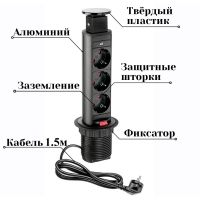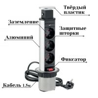 Спецификация Наименование AE-BPW3S60-80 Количество розеток 3 EURO Напряжение 200-250 В Максимальный ток 16 А Максимальная мощность 3600 Вт Цвет корпуса Серебристый Врезное отверстие Диаметр — 60 мм Выдвижная розетка сертифицирована в РФ. Гарантия 2 года. Выдвижная розетка GTV AE-BPW3S60-80 (серебристая). Основание корпуса изготовлено из алюминия, торцевая часть розетки и корпус, из соображений безопасности выполнен из прочного пластика. Качественная порошковая окраска корпуса позволяет долгое время сохранить внешний вид нового изделия, розетка не царапается. Механизм розетки выполнен по технологии POP-UP. В закрытом состоянии розетка образует практически ровную поверхность со столешницей. Для открытия нажмите на «пятачок» он поднимется, потяните розетку в верх до ее фиксации — розетка готова к работе. Данная модель готова к эксплуатации вся внутренняя разводка уже сделана на заводе, в комплекте с сетевым шнуром длиной 1,5 м, необходимо только подключить изделие к розетке. Комплект поставки так же входит инструкция по установке изделия в столешницу, с подробной схемой и указанием всех размеров. Сфера применения: Выдвижные розетки отлично подходят для установки в столешницу на кухне, что помогает экономить рабочее пространство. В закрытом положении встраиваемая розетка образует со столешницей практически ровную поверхность. Также выдвижные розетки нашли распространение в офисах, переговорных залах, стойках обслуживания клиентов.