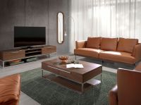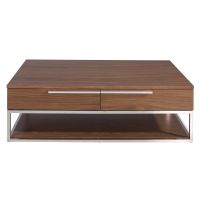 Прямоугольный журнальный столик со структурой из шпона орехового дерева с двумя выдвижными ящиками. Структура ножек и ручек из хромированной нержавеющей стали.