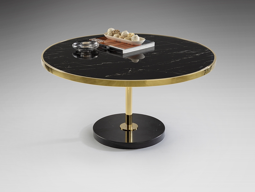 Журнальный столик из нержавеющей стали, позолоченная отделка. Основание из черного мрамора и столешница из закаленного стекла с отделкой под черный мрамор.