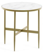 Журнальный столик Elisenda круглый от фабрики La Forma – элегантный вид для утонченных интерьеров. Журнальный столик Elisenda с первого взгляда подкупает своей шикарно выполненной столешницей. Здесь ударопрочное стекло имеет мраморный рисунок, отчего столешница смотрится одновременно роскошно и необычно. Глянцевый мрамор – это оригинально и практично. А большая площадь поверхности позволит разместить не только чашку с кофе. Стол круглой формы. Столешница имеет толщину 2 см и выполнена из закаленного стекла с имитацией мрамора. Она ударопрочная, легко очищается от загрязнений. Опора металлическая. Это прочная сталь с позолоченным покрытием. Четыре ножки удерживают обруч, который окантовывает столешницу. Ножки трубчатые, заужены в нижней части. Вверху их диаметр составляет 2 см, а внизу – 0,8 см. У каждой есть наконечник, который защищает напольное покрытие от повреждений. Максимальная нагрузка на столик не должна превышать 25 кг. Размеры: диаметр – 50 см, высота – 49 см. Вес – 6.1 кг. Потребуется небольшая самостоятельная сборка. В коллекцию Elisenda также входят консоль и журнальный стол, выполненные в том же дизайне.