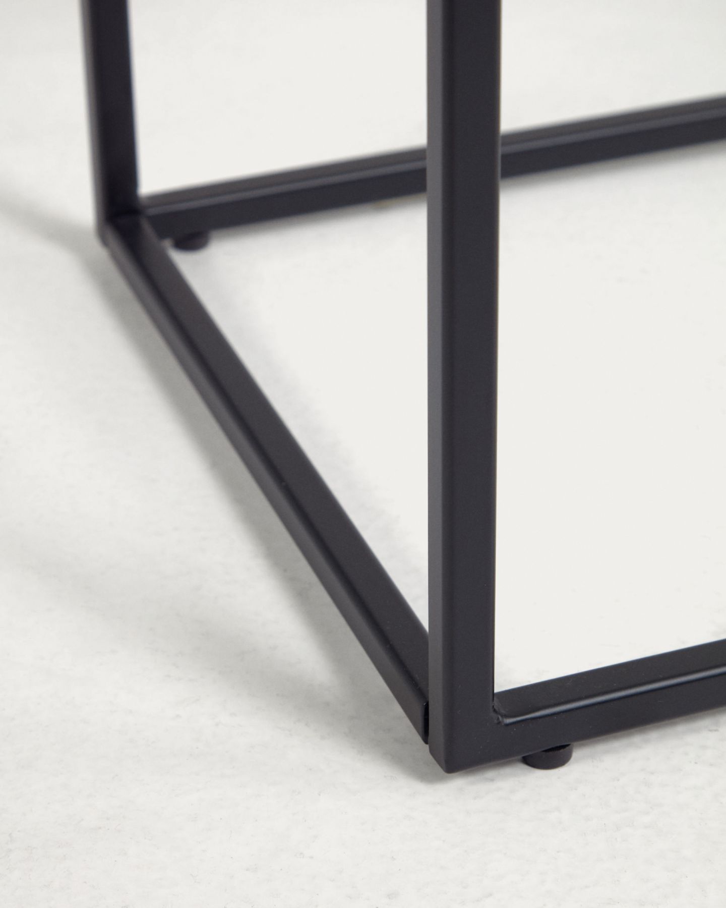 Приставной стол Rewena от фабрики La Forma – керамическая столешница на стальном основании в духе минимализма. Приставной стол Rewena не оставляет сомнений в том, что является ярким представителем минимализма. Простая конструкция и практичность, прочность и современные материалы – все это видно невооруженным взглядом. Когда нужно добавить немного удобства в интерьер, но без «перегруза», то Rewena будет кстати. Стол прямоугольной формы. Столешница сделана из закаленного стекла и керамики (двухслойная). Она имеет толщину 7 мм, ударопрочная, легко очищается от загрязнений. Каркас металлический, покрыт черной порошковой краской. Он имеет сварную рамочную структуру, с шириной ножек 1,3 см. Для защиты напольного покрытия, на углах основания предусмотрены пластиковые накладки. Максимальная нагрузка на столик не должна превышать 30 кг. Размеры: ширина – 45 см, глубина – 30 см, высота – 60 см. Вес – 5,9 кг. Потребуется сборка.