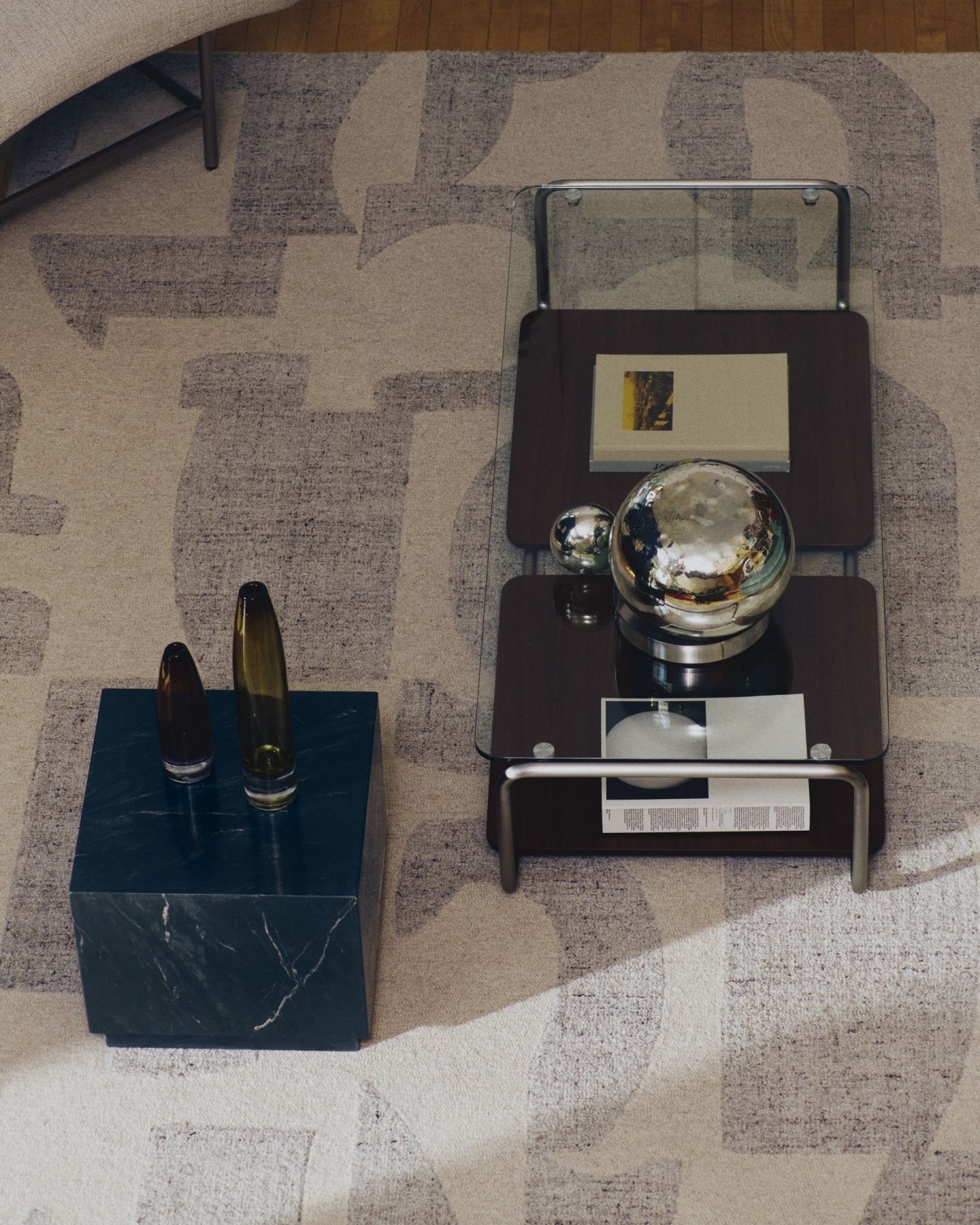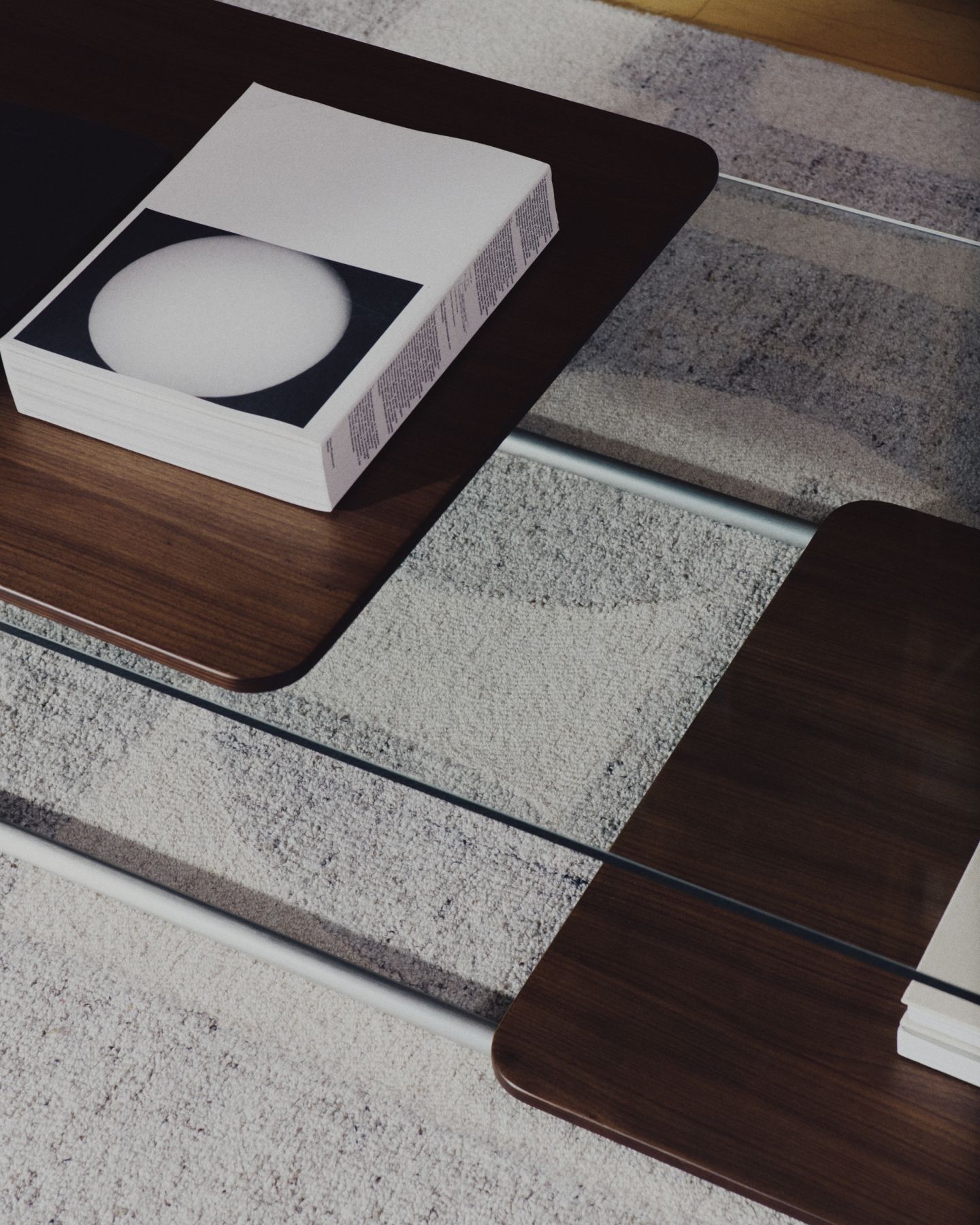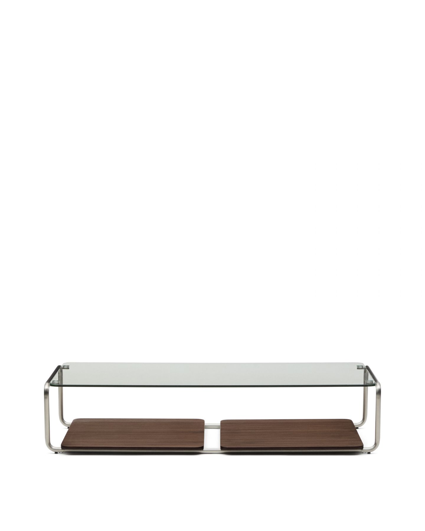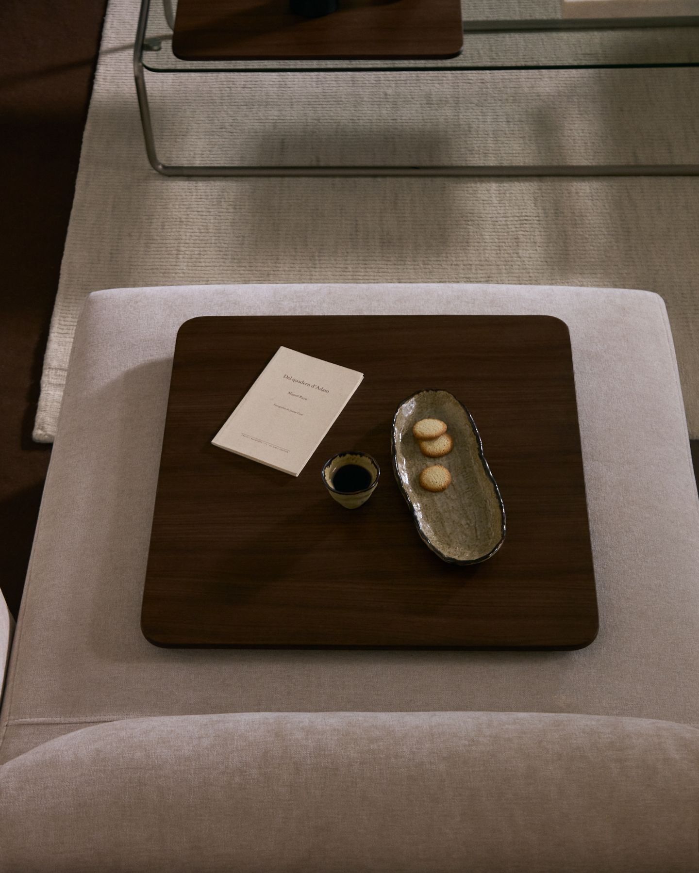 Tarsel переосмысливает элегантность середины века в современном ключе, идеально сочетая функциональность и визуальную изысканность. Столешница из закалённого стекла добавляет лёгкости, позволяя трубчатой конструкции из нержавеющей стали с матовым эффектом подчеркнуть современный и изысканный штрих. Контраст с подносами из тёмного орехового шпона толщиной 0,6 мм подчёркивает богатство материалов коллекции, добавляя глубину и теплоту любому пространству.